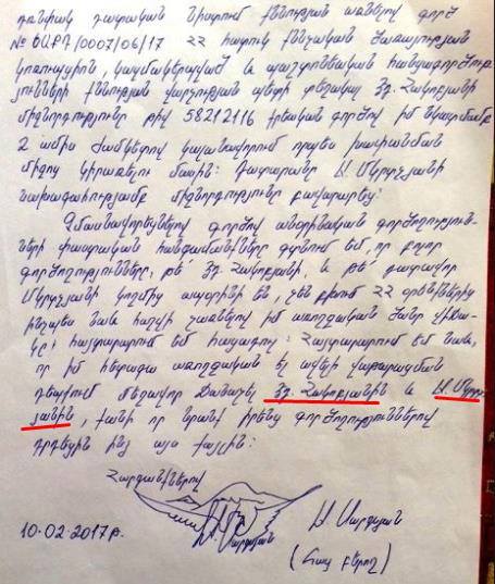 Հաց բերողի երկրորդ անգամ կալանավորվովելուց հետո՝ փետրվարի 2-ին գրած նամակում նա հայտարարում է իր առողջության հետագա վատթարացման դեպքում մեղավոր ճանաչել ՀՀ հատուկ քննչական ծառայության կոռուպցիոն, կազմակերպված և պաշտոնեական հանցագործությունների քննության վարչության պետի տեղակալ Էդ. Հակոբյանին և դատավոր Ա. Մկրտչյանին։