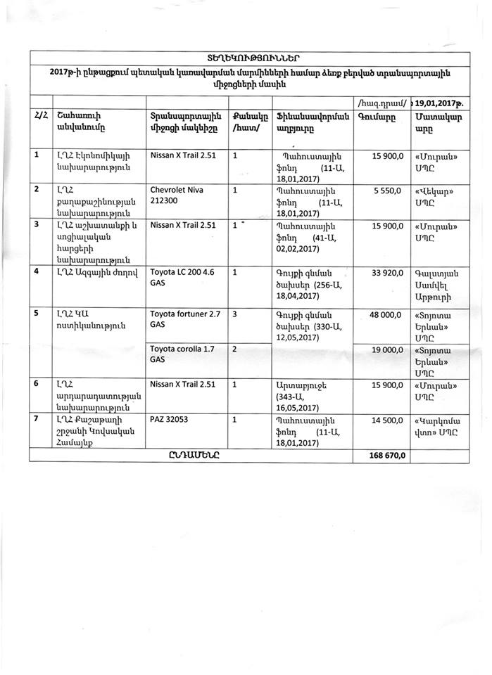 Արցախի խորհրդարանի պատգամավոր, «Ազգային վերածնունդ» կուսակցության ղեկավար Հայկ Խանումյանը իր Ֆեյսբուքի էջում տեղադրել է մի փաստաթուղթ, համաձայն որի՝ 2017-ին Արցախի տարբեր պետական կառույցների համար գնվել են թանկարժեք ծառայողական մեքենաներ՝ ընդհանուր 169 միլիոն դրամ արժեքով: