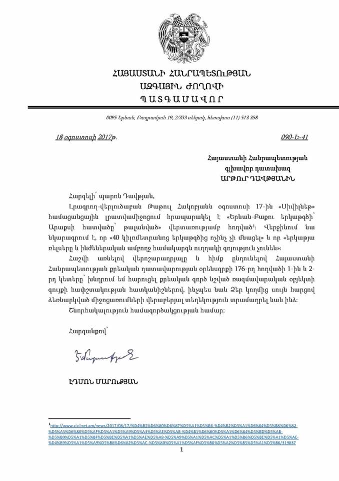 «Այսօր առավոտյան գրությամբ դիմել եմ ՀՀ գլխավոր դատախազ Արթուր Դավթյանին՝ խնդրելով քրեական գործ հարուցել լրագրող-վերլուծաբան Թաթուլ Հակոբյանի՝ օգոստոսի 17-ին «Սիվիլնեթ» համացանցային լրատվամիջոցում հրապարակած «Երևան-Բաքու երկաթգծի՝ Արաքսի հատվածը՝ թալանված» վերտառությամբ հոդվածի առթիվ, որում մասնավորապես նկարագրվում է, որ «40 կիլոմետրանոց երկաթգծից ոչինչ չի մնացել» և որ «երկաթյա ռելսերը և ինժեներական ամբողջ համակարգն ուղղակի գոյություն չունեն»։