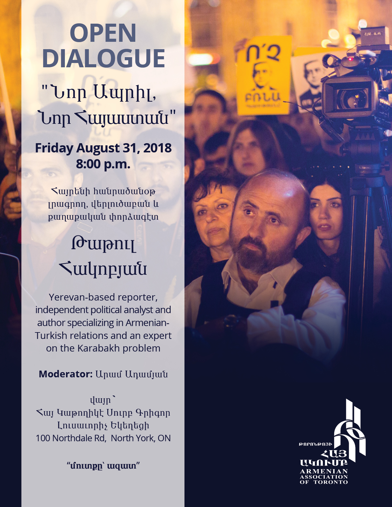 2018 թվականի օգոստոսի 31-ի երեկոյան Տորոնտոյում՝ Կանադա (Հայ կաթողիկե Սուրբ Գրիգոր Լուսավորիչ եկեղեցի, 100 Northdale Rd, North York, ON) «Նոր Ապրիլ, Նոր Հայաստան» թեմայով դասախոսություն կկարդա լրագրող Թաթուլ Հակոբյանը: