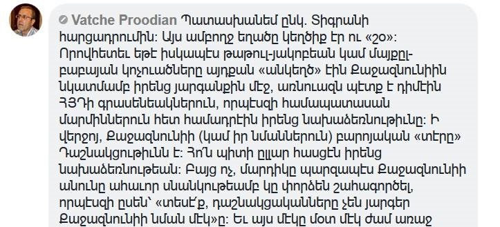Իմ ընկերներից մեկը, ով ՀՅԴ անդամ է (ես, ի ծնե անկուսակցական եմ և այդպես էլ կմնամ, քանի դեռ լրագրության մեջ եմ, իսկ լրագրության մեջ կմնամ հավանաբար մինչև մահ: Ես տասնյակ, եթե չասեմ հարյուրն անց ընկերներ ունեմ ՀՅԴ-ից՝ Հայաստանում, Արցախում և Սփյուռքում, որոնց հարգում եմ, ինչպես իմ մյուս ընկերներին), ինձ ուղարկեց «դաշնակցականներ/arf members» փակ խմբում ծավալված մի քննարկում, որը իրավունք չունեմ ամբողջապես հանրայնացնելու: