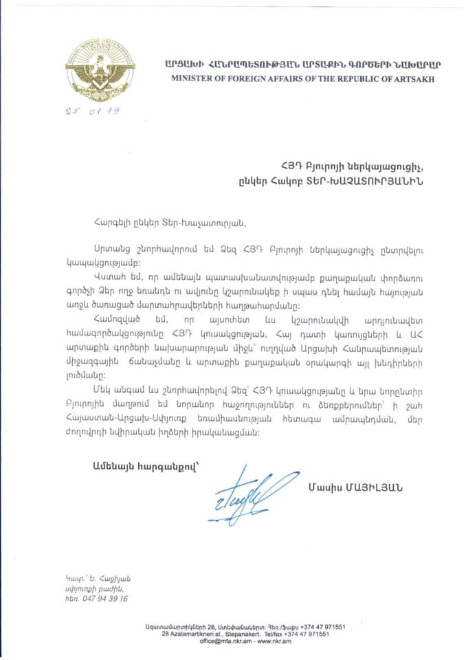 Արցախի Հանարպետության արտաքին գործերի նախարար Մասիս Մայիլյանը շնորհավորական նամակ է հղել ՀՅԴ Բյուրոյի ներկայացուցիչ Հակոբ Տեր-Խաչատուրյանին: