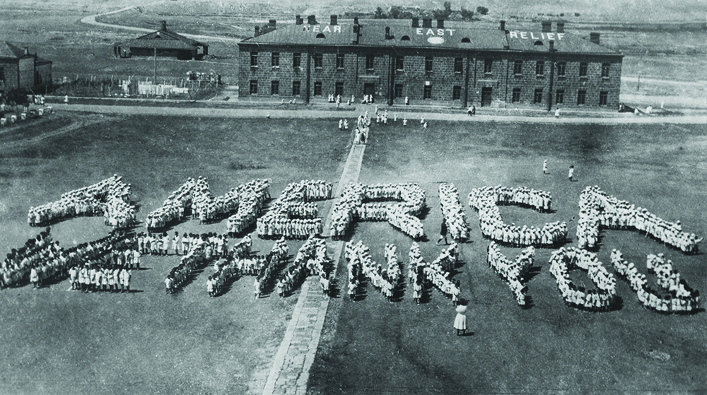 Ալեքսանդրապոլում Մերձավոր Արևելքի ամերիկյան նպաստամատույց կոմիտեի «Սևերսկի» նախկին զորանոցի տարածքում գտնվող որբանոցի շուրջ 2000 հայ սանուհիները կանգնած են այնպիսի դասավորությամբ, որ կարելի է կարդալ «Ամե՛րիկա, շնորհակալ ենք» բառերը՝ ի նշան երախտագիտության ամերիկացի ժողովրդի և ԱՄՆ կառավարության: Գրության հետևում երևում է Նպաստամատույցի որբանոցի շենքերից մեկը` «Near East Relief» գրությամբ: Մերձավոր Արևելքի ամերիկյան նպաստամատույցի նախաձեռնությամբ այս և համանման այլ լուսանկարներով թողարկվեցին նաև փոստային բացիկներ: