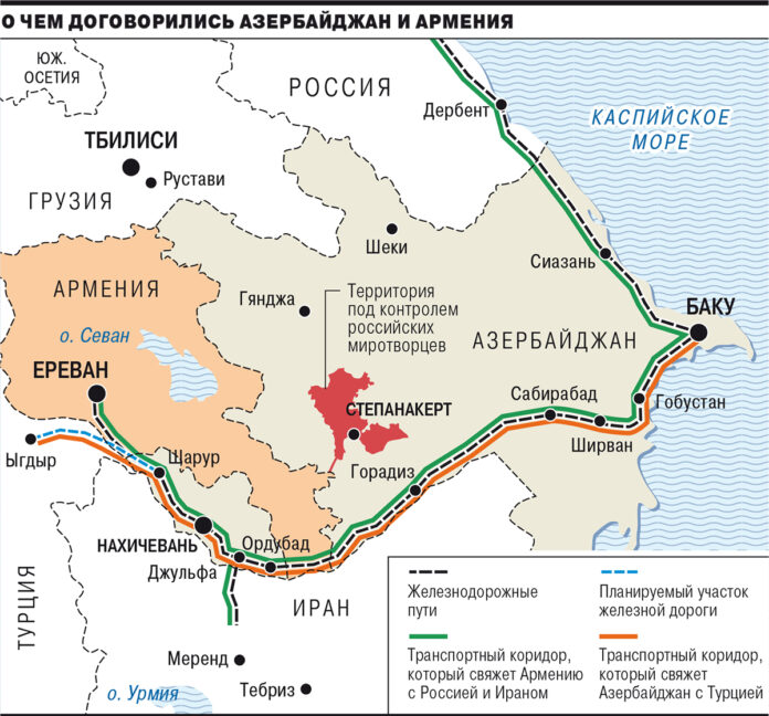 И в Баку, и в Ереване активно дискутировали по поводу итогов встречи премьера Армении Никола Пашиняна и президента Азербайджана Ильхама Алиева, прошедшей накануне в Москве при посредничестве президента РФ Владимира Путина. На ней была достигнута договоренность о создании рабочей группы во главе с вице-премьерами трех стран, которая займется «разблокировкой всех экономических и транспортных связей в регионе». Речь идет о двух основных направлениях. Во-первых, это коридор из основной части Азербайджана в анклав — Нахичевань, который должен пройти через Сюникскую область Армении. А во-вторых, железная дорога из Еревана в ту же Сюникскую область, которая проложена через Нахичевань. Оба маршрута активно использовались в советское время, но с началом нагорно-карабахского конфликта прекратили существование.