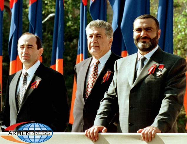 1999 թվականի Սեպտեմբերի 21. Հայաստանի անկախության օրը: Լուսանկարում՝ նախագահ Ռոբերտ Քոչարյան, Ազգային ժողովի խոսնակ Կարեն Դեմիրճյան, վարչապետ Վազգեն Սարգսյան: