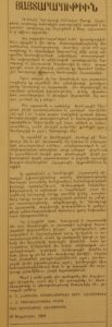 Կը սպասենք որ խորհրդային մամուլը թէ՛ Մոսկուայի մէջ եւ թէ՛ Հայաստանի մէջ ճշգրիտ եւ ամբողջական անդրադարձում ունենայ. տեղեկատուական եւ թէ՛ մեկնաբանական տեսակէտէ, տեղի ունեցած դէպքերուն եւ արարաքներուն մասին, ըստ խորհրդային վերին իշխանութեան կողմէ յայտարարուած եւ բոլորէն ողջունելի հրապարակայնութեան (կլազնոսթ) սկզբունքներուն եւ ոգիին: