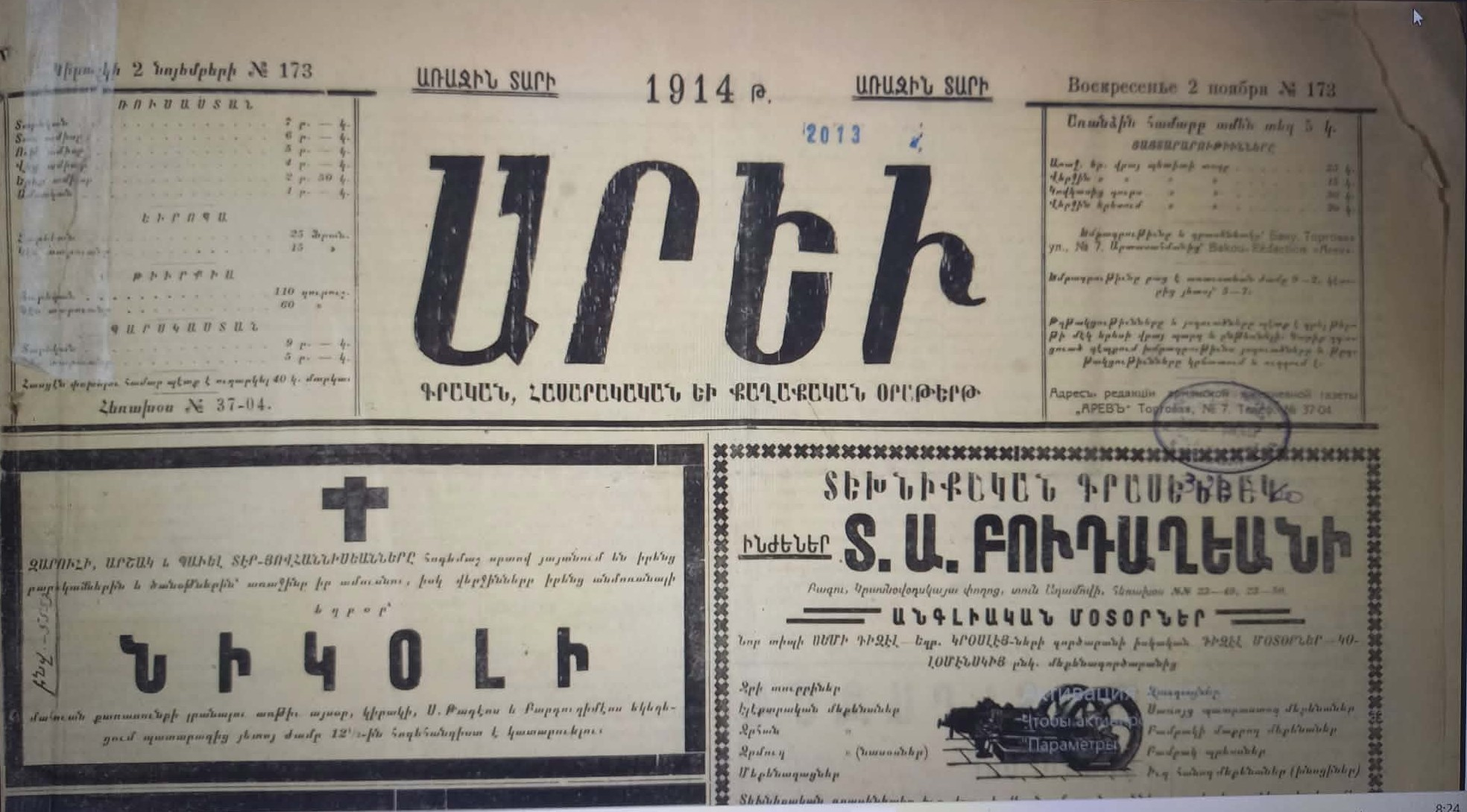 «Արև» օրաթերթը 1915 թվականին ունեցել է գրական-պատմական պատկերազարդ հավելված: