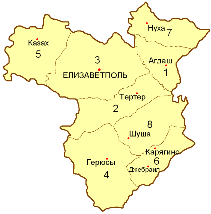 Ելիզավետպոլի նահանգի մյուս գավառներն էին՝ Արեշ, Նուխի, Ջեբրայիլ, Ելիզավետպոլ, Զանգեզուր, Ղազախ և Շուշի: